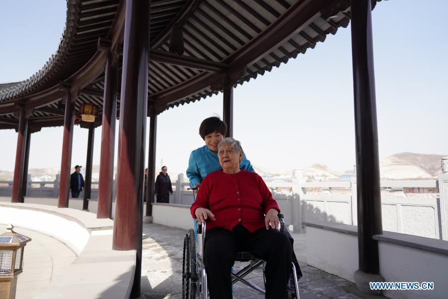 An elderly woman enjoys leisure time with a nursing worker at the Tangshan Anxin Medical Pension Manor in Guye District of Tangshan City in north China's Hebei Province, March 24, 2021. (Xinhua/Mu Yu)