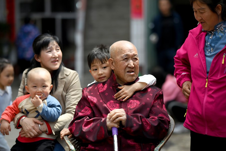 Hu Zaizhong takes a rest with family members at Xuejiawan Village, Liulin County, Lyuliang City of north China's Shanxi Province, on April 24, 2021. (Xinhua/Liu Liangliang)