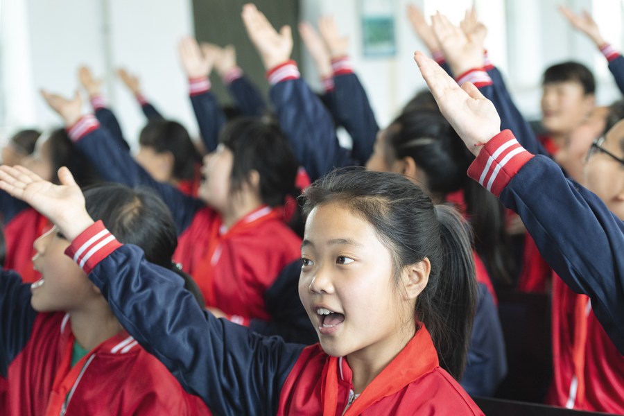 Children in the music class practice chorus at the Renmin Town Central Primary School in Renmin Town of Anda City, northeast China's Heilongjiang Province, May 25, 2021. (Xinhua/Xie Jianfei)