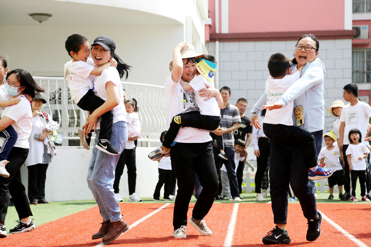 Children and their parents participate in games and activities at a kindergarten in Lianyungang, Jiangsu province, on Sunday. The event was held to mark International Children's Day, which falls on Tuesday. WANG CHUN/XINHUA