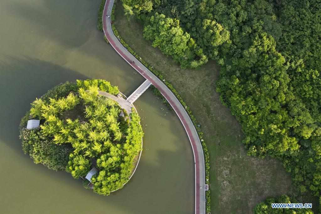 Aerial photo taken on May 28, 2021 shows the view of a city park along Chanhe River in Xi'an, northwest China's Shaanxi Province. (Xinhua/Shao Rui)