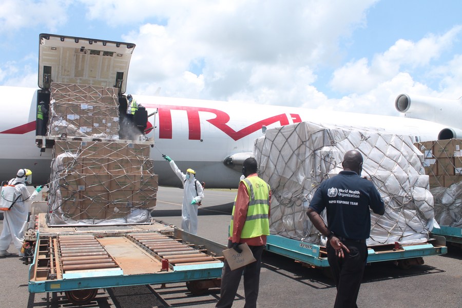 Workers disinfect medical supplies donated by the World Health Organization at Juba International Airport in Juba, South Sudan, on Sept. 4, 2020. (Photo by Gale Julius/Xinhua)