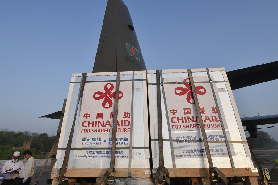 Photo taken on May 12, 2021 shows China-donated COVID-19 vaccines unloaded from a military transport plane in Dhaka, Bangladesh. (Xinhua)