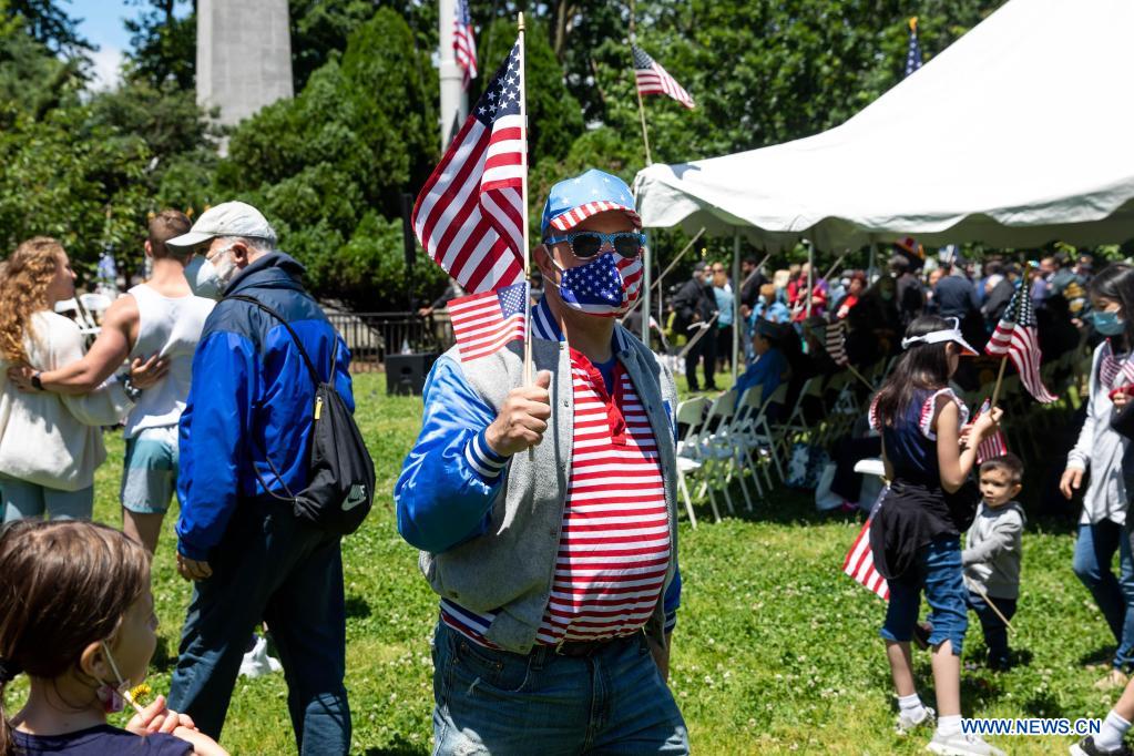 People hold flags at a memorial service after Brooklyn's 154th Memorial Day parade and motorcade in the Brooklyn borough of New York, the United States, on May 31, 2021. New Yorkers on Monday commemorated U.S. Memorial Day holiday with gatherings and shows to honor military service members and celebrate the coming of summer. (Xinhua/Michael Nagle)