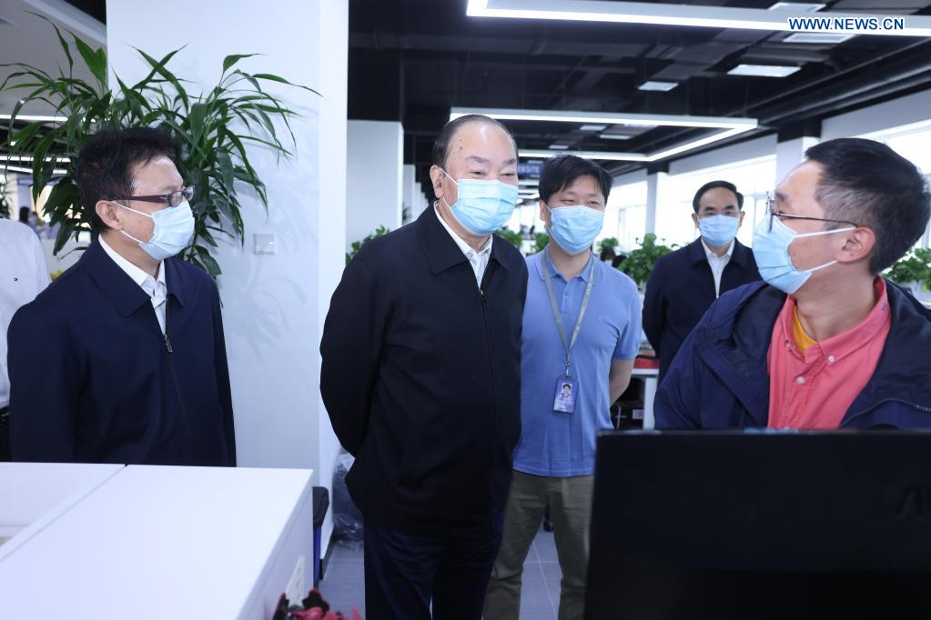 Huang Kunming, a member of the Political Bureau of the Communist Party of China (CPC) Central Committee and head of the Publicity Department of the CPC Central Committee, talks with a staff member of China Daily newspaper in Beijing, capital of China, June 1, 2021. Huang on Tuesday addressed a ceremony marking the 40th anniversary of the newspaper's launch. (Xinhua/Liu Bin)