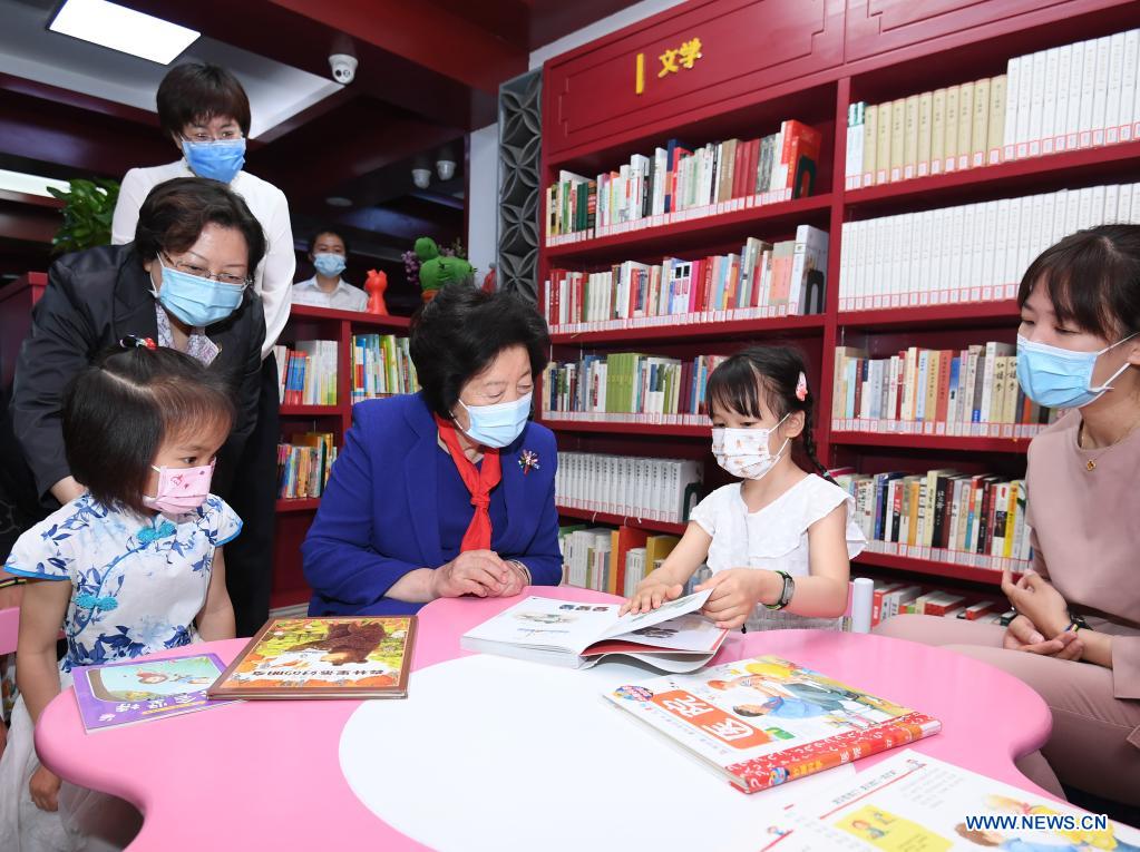 Sun Chunlan, a member of the Political Bureau of the Communist Party of China Central Committee and head of the National Working Committee on Children and Women under the State Council, extends festival greetings to children of all ethnic groups in China and sends regards to all who work for the benefit of children when attending a children's day celebration at a library in Beijing, capital of China, June 1, 2021. (Xinhua/Shen Hong)