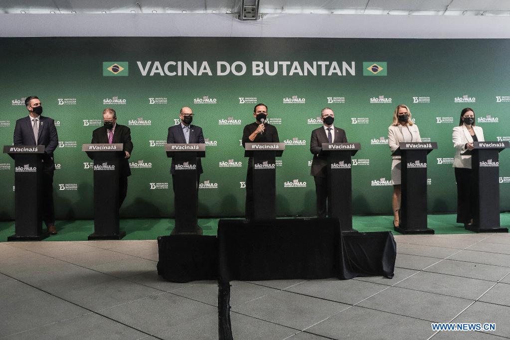 Photo taken on May 31, 2021 shows a scene of a press conference in Sao Paulo, Brazil. An unprecedented experiment in the world, carried out in Brazil's small town of Serrana, in Sao Paulo State, has succeeded in reducing new deaths from COVID-19 by 95 percent and controlling the pandemic after 75 percent of the adult population received two doses of Chinese company Sinovac's CoronaVac vaccine, local authorities said. (Photo by Rahel Patrasso/Xinhua)