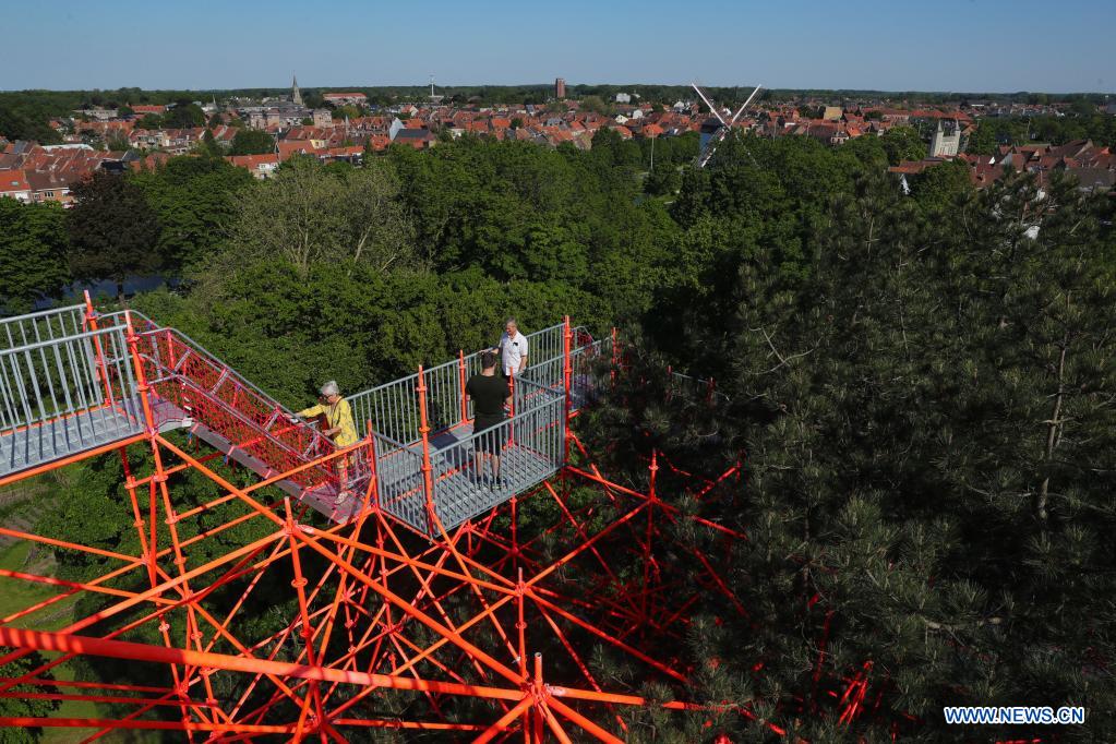 People experience the art installation "Strangler" by Hector Zamora in Bruges, Belgium, June 1, 2021. From May 8 to Oct. 24, the third Triennial Bruges brings contemporary art and architecture to the city with rich history. With the theme "TraumA," art pieces created by thirteen artists and architects were shown in different places in the city. (Xinhua/Zheng Huansong)