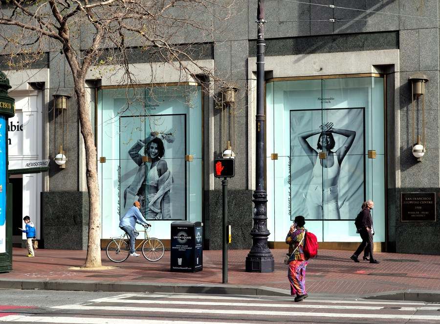 People walk past the windows of a department store in San Francisco, California, the United States, March 24, 2021. (Xinhua/Wu Xiaoling)