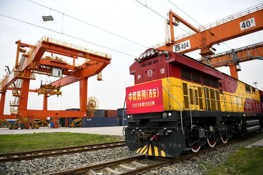 The X9041 train prepares to leave Xi'an International Port for Kazakhstan in Xi'an, northwest China's Shaanxi Province, April 13, 2021. (Xinhua/Li Yibo)