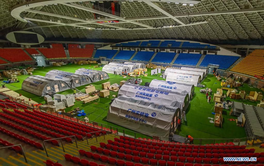 Temporary laboratories for nucleic acid testing are seen in a stadium in Guangzhou, capital of south China's Guangdong Province, June 1, 2021. Four nucleic acid testing laboratories, with each unit covering an area of 210 square meters, were erected in early morning on June 2, and are about to put into use on June 3. The laboratories are able to test over 120,000 samples a day, which will significantly improve the city's testing capability. (Xinhua/Liu Dawei)