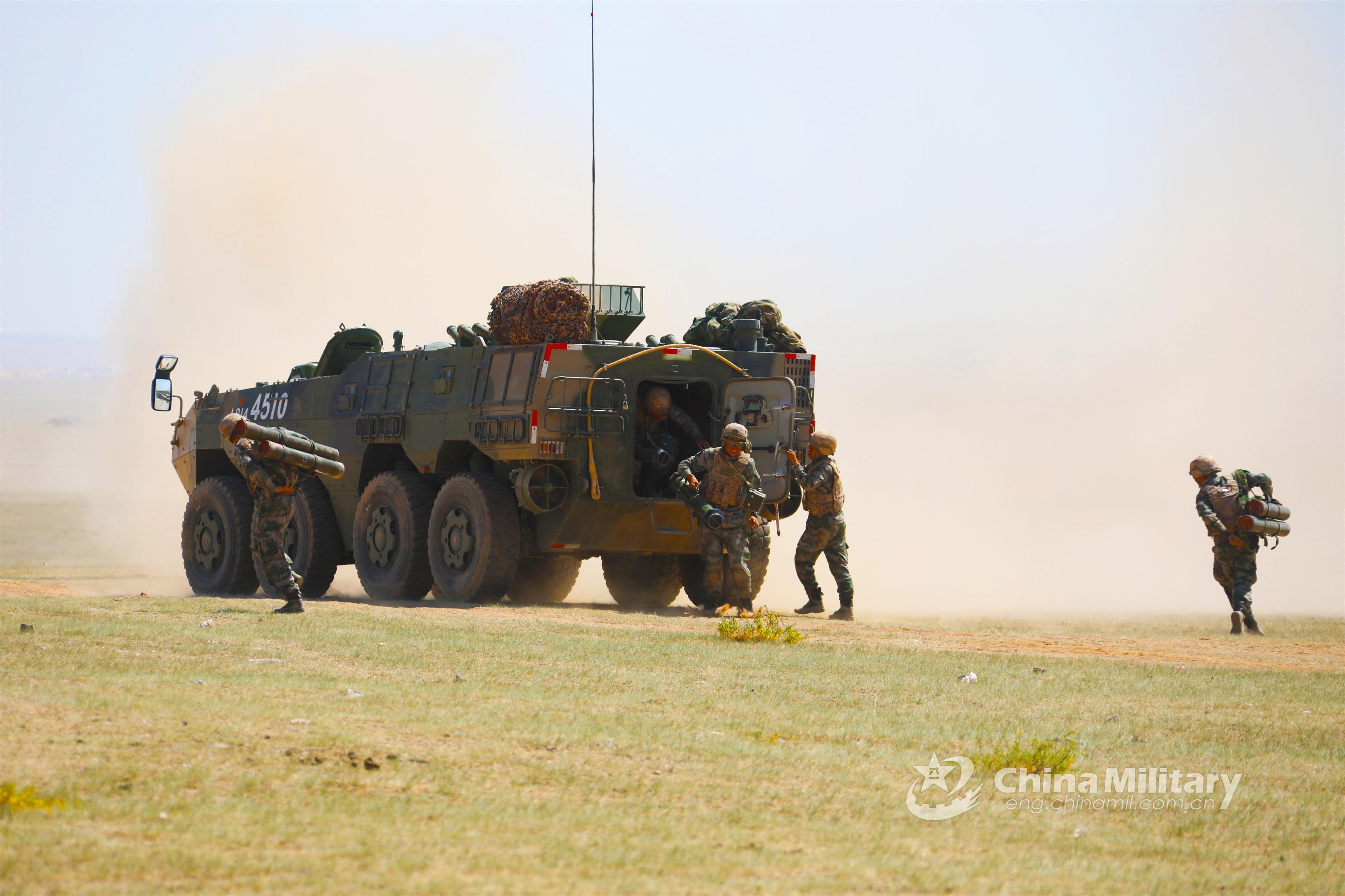Soldiers assigned to a combined arms brigade under the PLA 78th Group Army quickly jump out of an armored vehicle and keep in fighting trim during the tactical training in early June, 2021. (eng.chinamil.com.cn/Photo by Zhang Yanjun)