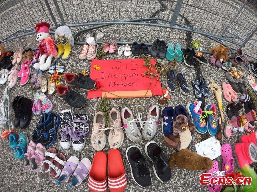 Children's shoes, dolls, flowers with notes at the front of Legislative Assembly of Ontario, Toronto, Ontario, Canada, June 2, 2021. (China News Service/Yu Ruidong)