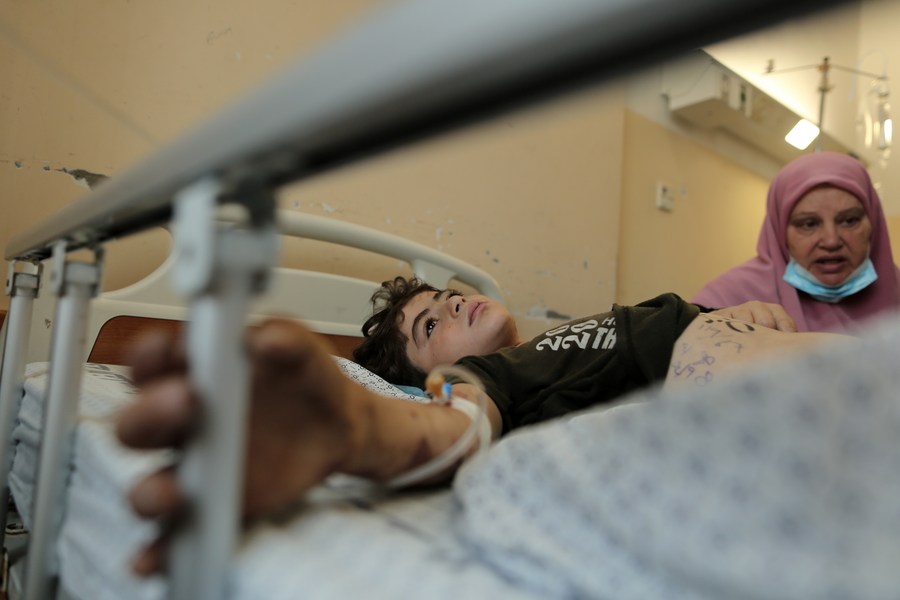 A Palestinian boy, who was wounded in Israeli airstrikes, lies at Nasser Hospital in the southern Gaza Strip city of Khan Younis, on May 20, 2021. (Photo by Yasser Qudih/Xinhua)
