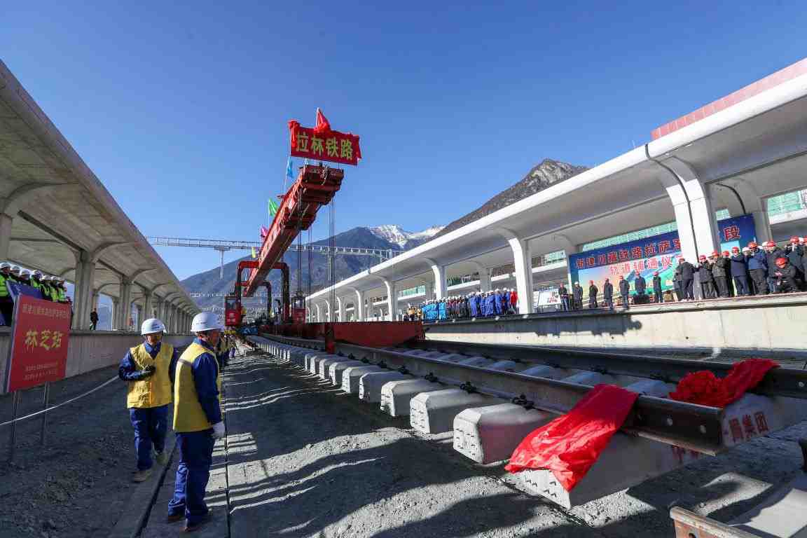 The track-laying work of the Lhasa-Nyingchi Railway in southwest China’s Tibet autonomous region is completed by construction workers with China Railway 11 Bureau Group Corporation, Dec. 31, 2020. (Photo by Xu Yunhua/People’s Daily Online)