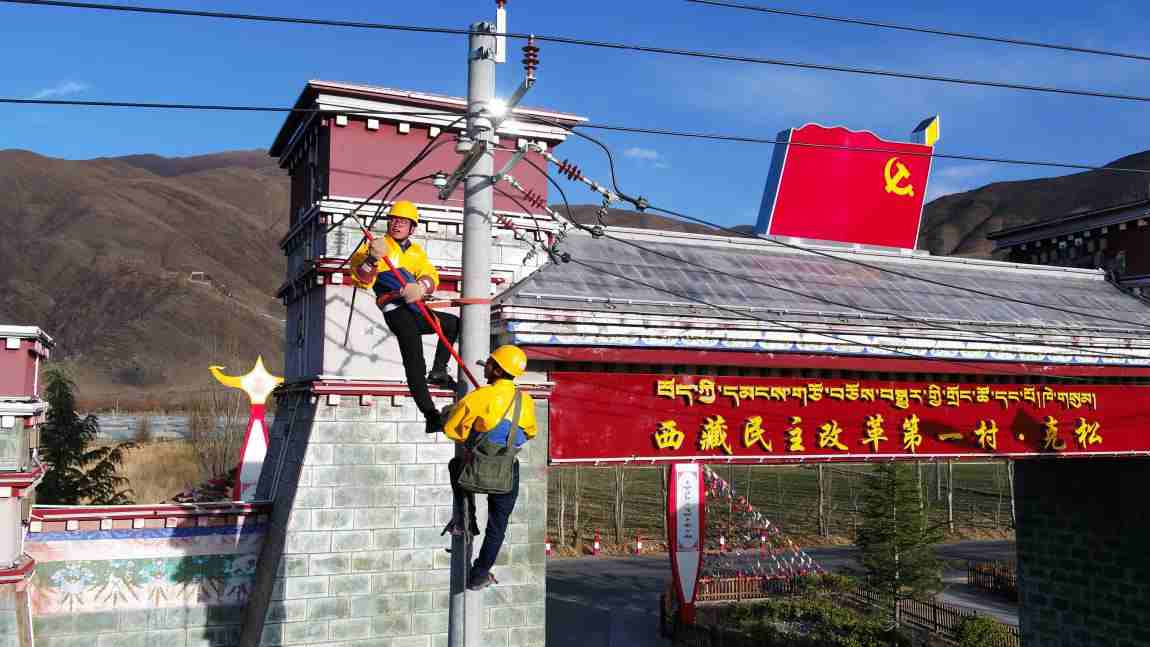 Local electricity workers install a new transformer without cutting off the electricity at Kesong village, Shannan city, southwest China’s Tibet autonomous region, with the help of technicians sent from east China’s Anhui province to aid Tibet, Dec. 4, 2019. (Photo by Ma Yong/People’s Daily Online)