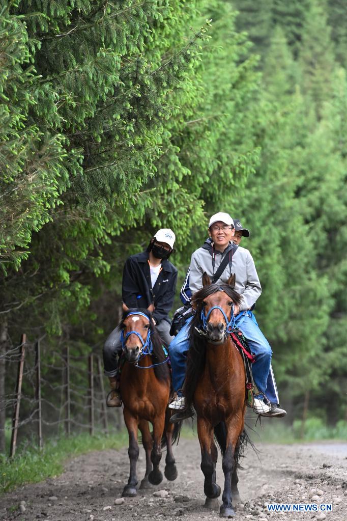 Tourists ride horse at the Narat scenic spot in Xinyuan County, northwest China's Xinjiang Uygur Autonomous Region, June 3, 2021. A horse team cooperative of Araxan Village was founded in May 2013. A total of 200 horses have been engaging in tourism services during the tourist season from May to October, bringing job opportunities to 160 people and having helped 20 poor families get rid of poverty. (Xinhua/Ding Lei)