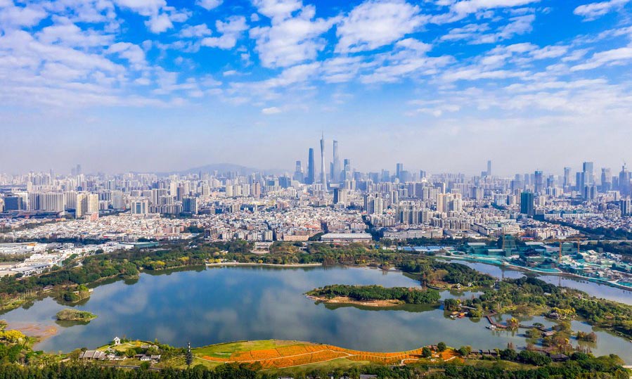 Aerial photo taken on Feb. 24, 2020 shows the Haizhu wetland and the Canton Tower in the distance in Guangzhou, south China's Guangdong Province. (Photo by Xie Huiqiang/Xinhua)