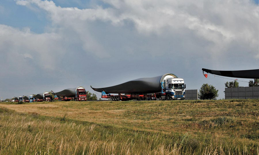 Trucks carrying Chinese-made wind turbine blades run along the highway between Karaganda and Nur-Sultan, in Kazakhstan, June 23, 2020. (Photo by Kalizhan Ospanov/Xinhua)