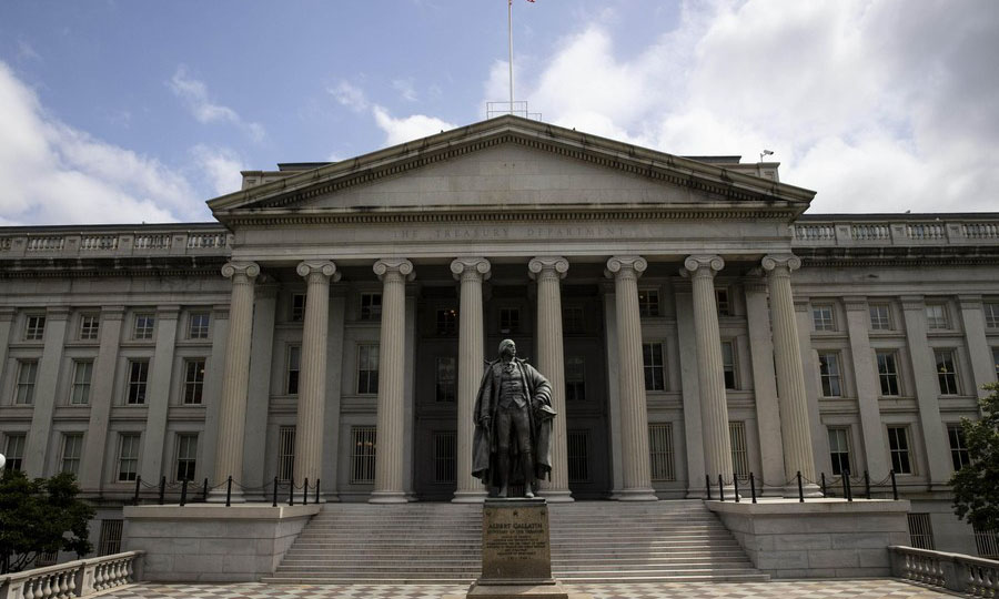 Photo taken on May 21, 2020 shows the U.S. Treasury Department building in Washington D.C., the United States. (Photo by Ting Shen/Xinhua)