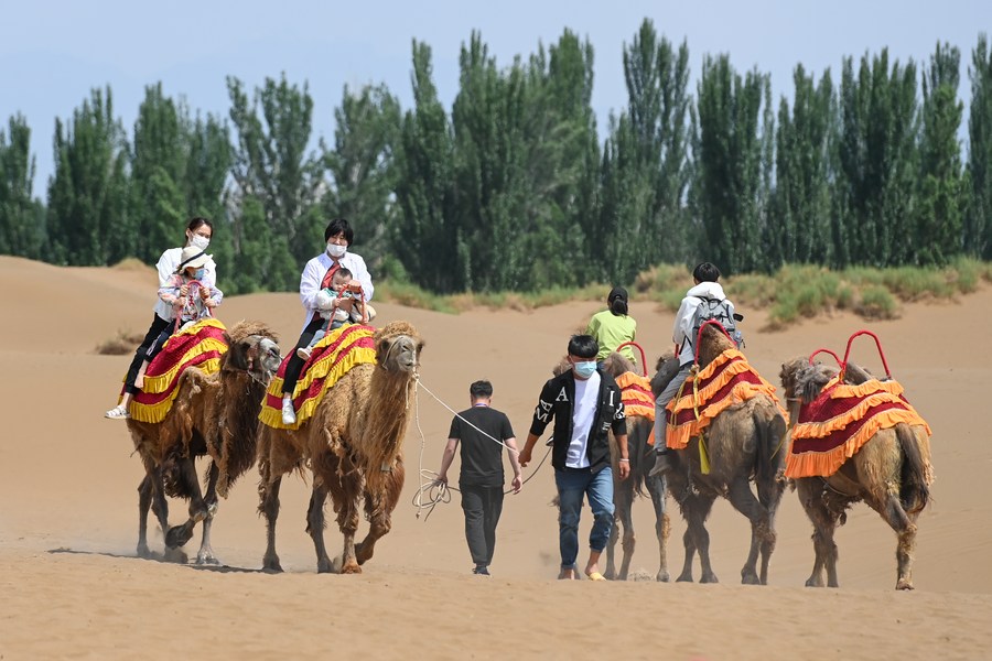 Visitors ride camels in Kumtag Desert in Shanshan County, northwest China's Xinjiang Uygur Autonomous Region, May 16, 2021. The county sees boom in desert tourism early May. (Xinhua/Ding Lei)