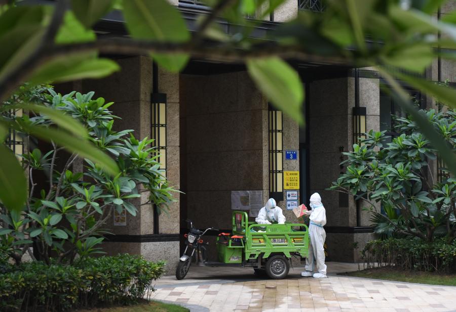 Staff members of a property management company deliver online shopping goods ordered by residents under home quarantine at a residential area at Liwan District of Guangzhou, capital of south China's Guangdong Province, June 2, 2021. (Xinhua/Deng Hua)