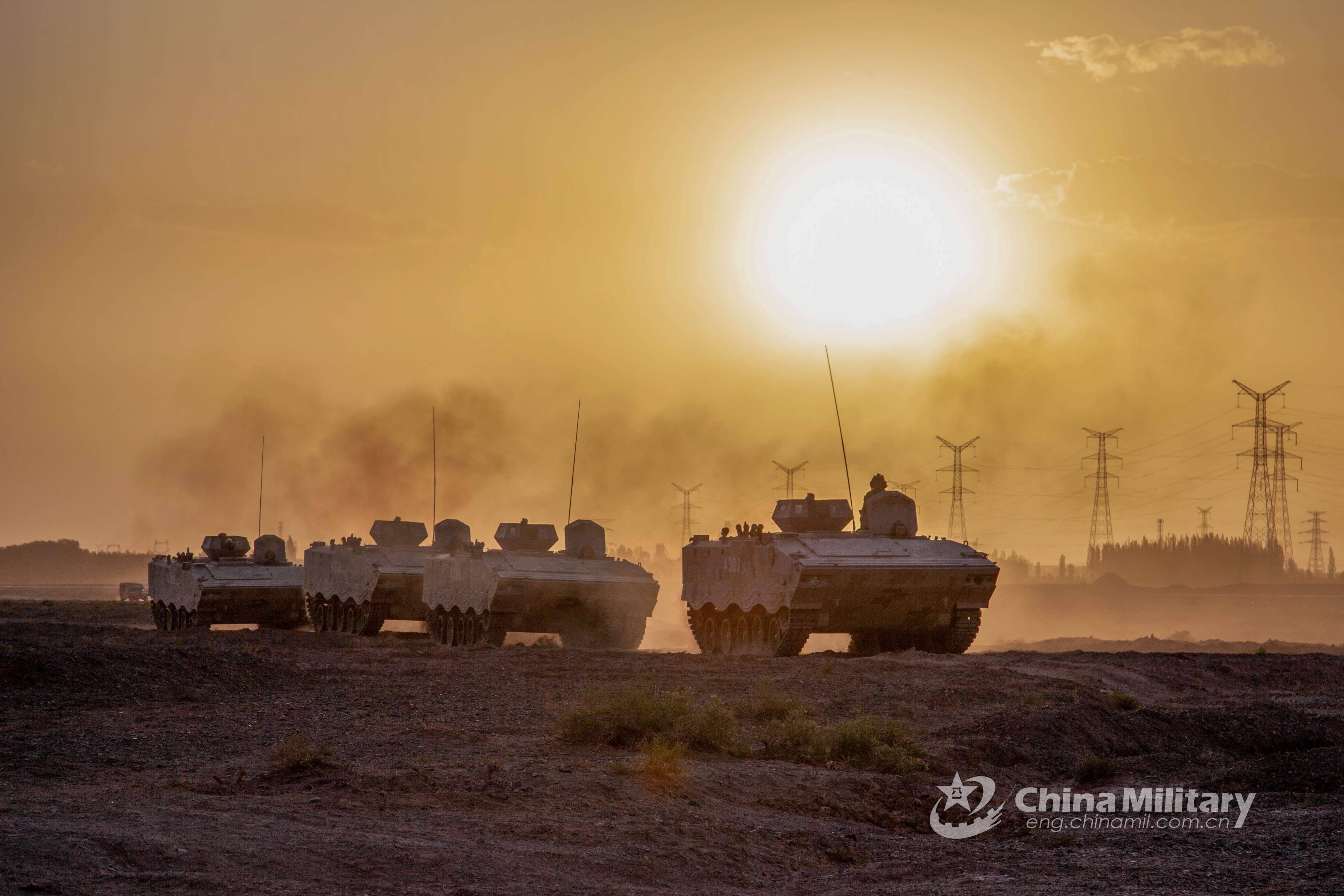 The armored vehicles attached to a combined arms brigade under the 77th Group Army rumble in formation through the wilds during the maneuver training on May 26, 2021. (eng.chinamil.com.cn/Photo by Zhang Danfeng)