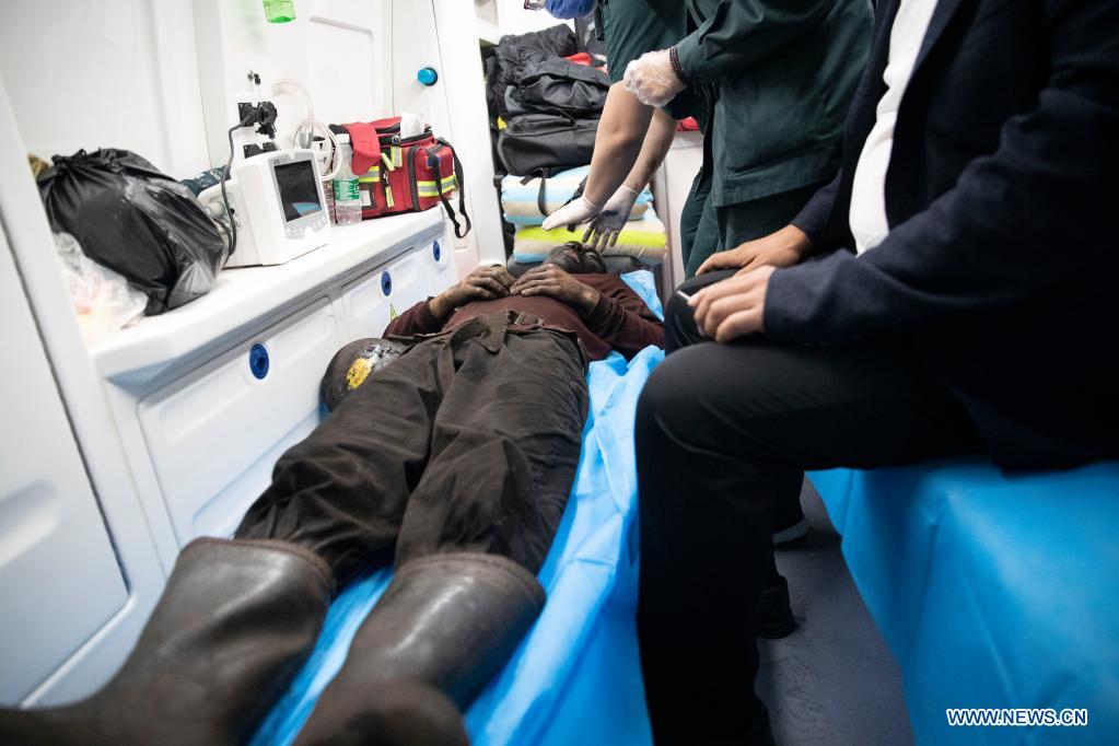 Medical workers take care of a miner rescued from the site of a coal mine accident in Jixi City of northeast China's Heilongjiang Province, June 6, 2021. All the eight miners trapped in a coal mine after a coal and gas outburst in Jixi City of northeast China's Heilongjiang Province have been lifted to the ground, rescuers said Sunday. The accident took place around 12:07 p.m. Saturday in the coal mine operated by the Jixi branch of the Longmay Mining Holding Group Co. Ltd., when the eight miners were working underground. Around 8:00 p.m., all the eight miners were lifted to the ground and sent to a hospital for physical examination. (Xinhua/Zhang Tao)