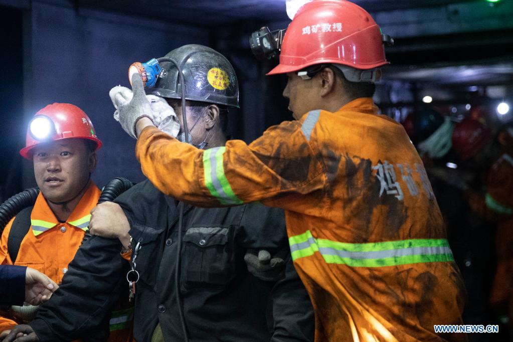 A trapped miner is lifted to the ground from the site of a coal mine accident in Jixi City of northeast China's Heilongjiang Province, June 6, 2021. All the eight miners trapped in a coal mine after a coal and gas outburst in Jixi City of northeast China's Heilongjiang Province have been lifted to the ground, rescuers said Sunday. The accident took place around 12:07 p.m. Saturday in the coal mine operated by the Jixi branch of the Longmay Mining Holding Group Co. Ltd., when the eight miners were working underground. Around 8:00 p.m., all the eight miners were lifted to the ground and sent to a hospital for physical examination. (Xinhua/Zhang Tao)