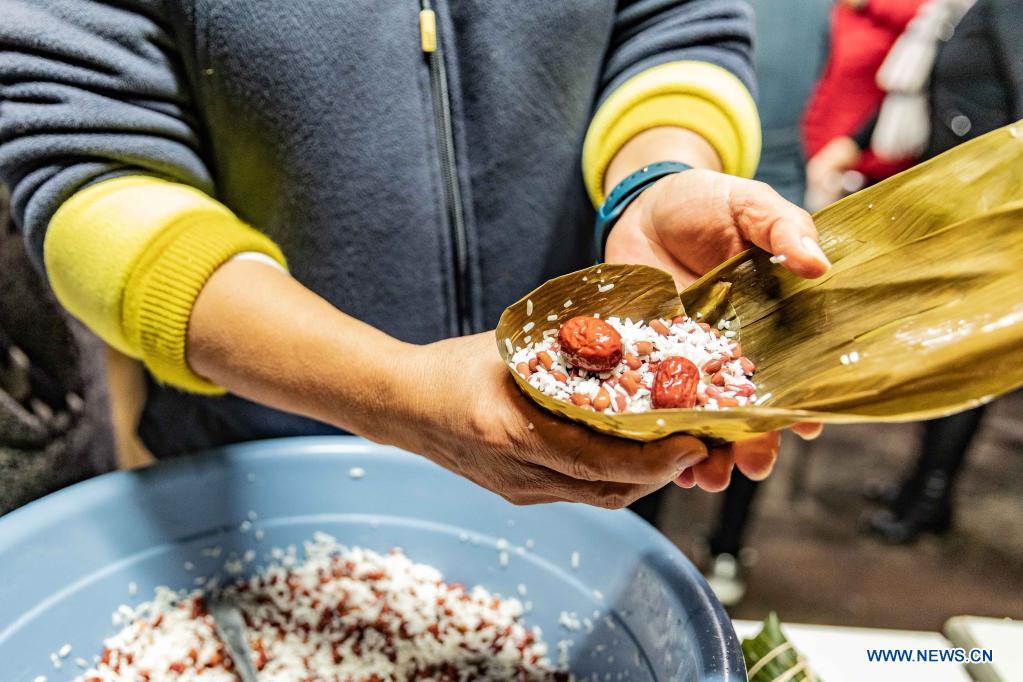 People make zongzi to celebrate the Dragon Boat Festival in Canberra, Australia, on June 6, 2021. Zongzi is a traditional Chinese delicacy made of rice and stuffing wrapped in reed or bamboo leaves, usually consumed on the occasion of Dragon Boat Festival, which falls on June 14 this year. (Photo by Chu Chen/Xinhua)