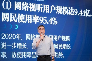 Photo shows a staff member introducing the latest report on the development of China's internet audio-and-video industry. (Photo courtesy of the sponsor)