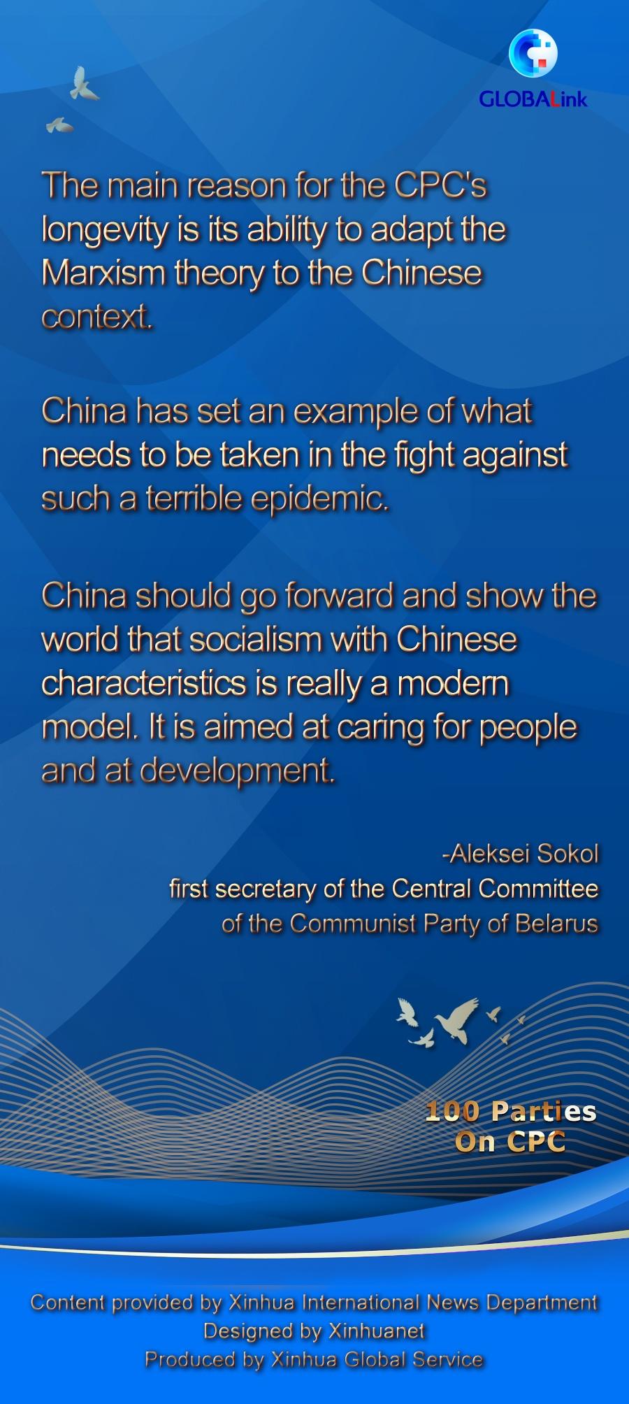 Under the CPC's leadership, China has become the only major economy in the world to see GDP growth in 2020 amid the COVID-19 pandemic, and "this is what speaks about the policy that is being pursued. It means that people are constantly developing," Aleksei Sokol, first secretary of the Central Committee of the Communist Party of Belarus, told Xinhua in a recent exclusive interview.
