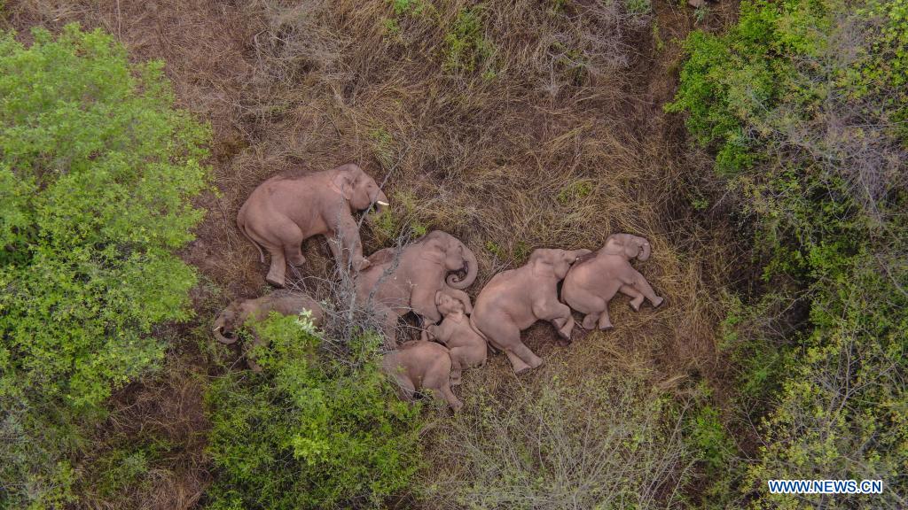 Aerial photo taken on June 7, 2021 shows wild Asian elephants in Jinning District of Kunming, southwest China's Yunnan Province. A herd of wild Asian elephants have made a temporary stop along their migration in the outskirts of the southwestern Chinese city of Kunming, authorities said Monday. Of the 15 elephants, one male has broken free from the herd and is currently about 4 km to the northeast of the group, according to the on-site command tracking the elephants. Asian elephants are under A-level state protection in China, where they are mostly found in Yunnan. Thanks to enhanced protection efforts, the wild elephant population in the province has grown to about 300, up from 193 in the 1980s. (Xinhua)