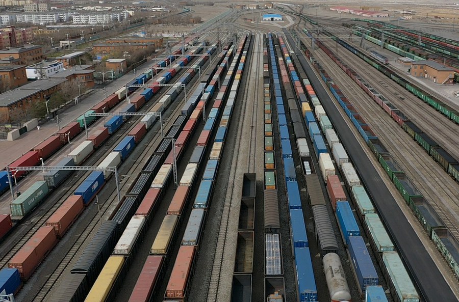 Aerial photo shows the Alashankou Railway Station in Alashankou City, northwest China's Xinjiang Uygur Autonomous Region, April 19, 2020. (Xinhua/Sadat)