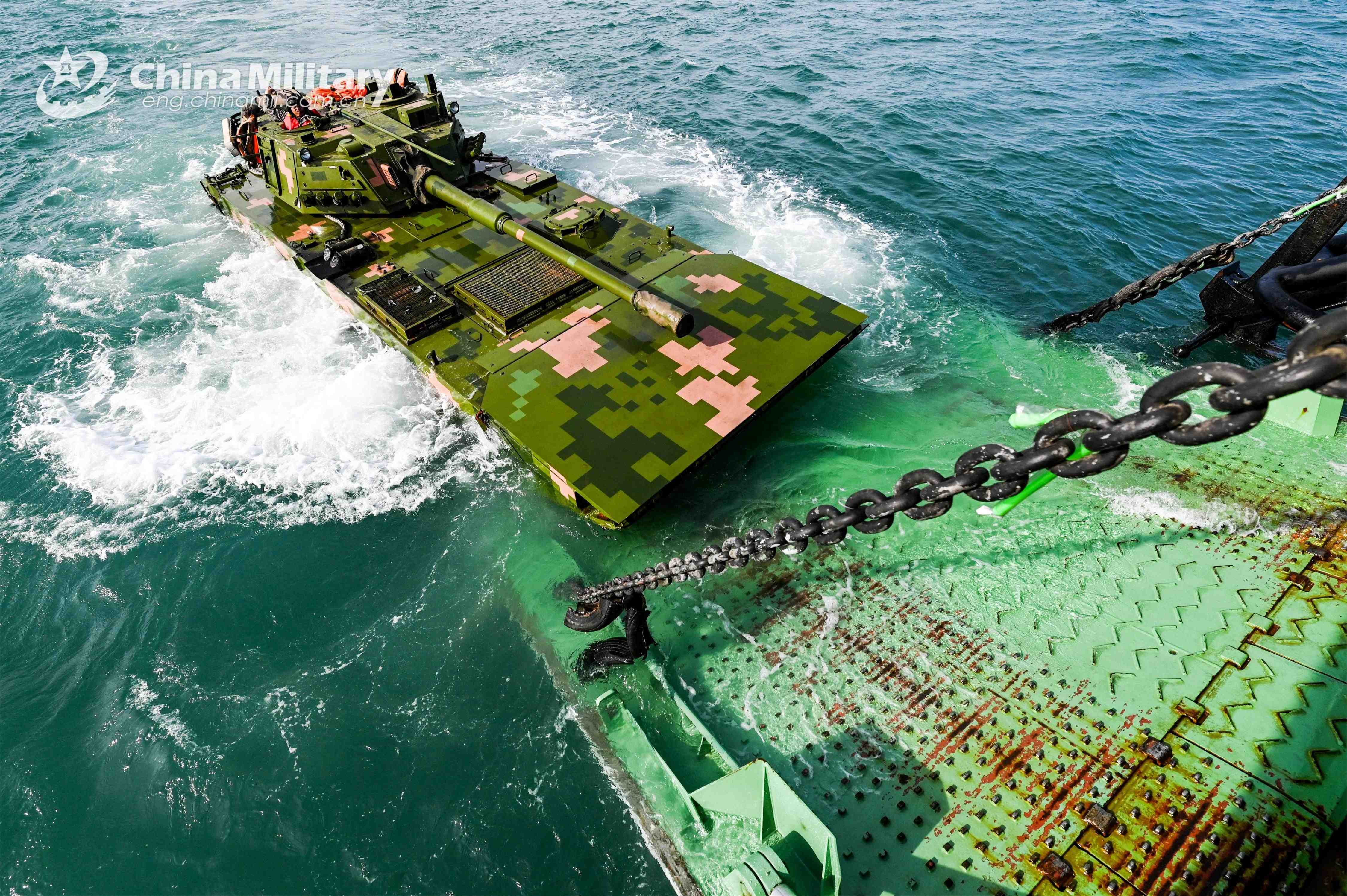 An amphibious armored infantry fighting vehicle (IFV) attached to a brigade under the PLA 73th Group Army enters the well dock of a landing ship during the coordination training aiming to hone the troops' combat capabilities in maritime operations on May 26, 2021. (eng.chinamil.com.cn/Photo by Lin Jiayu)