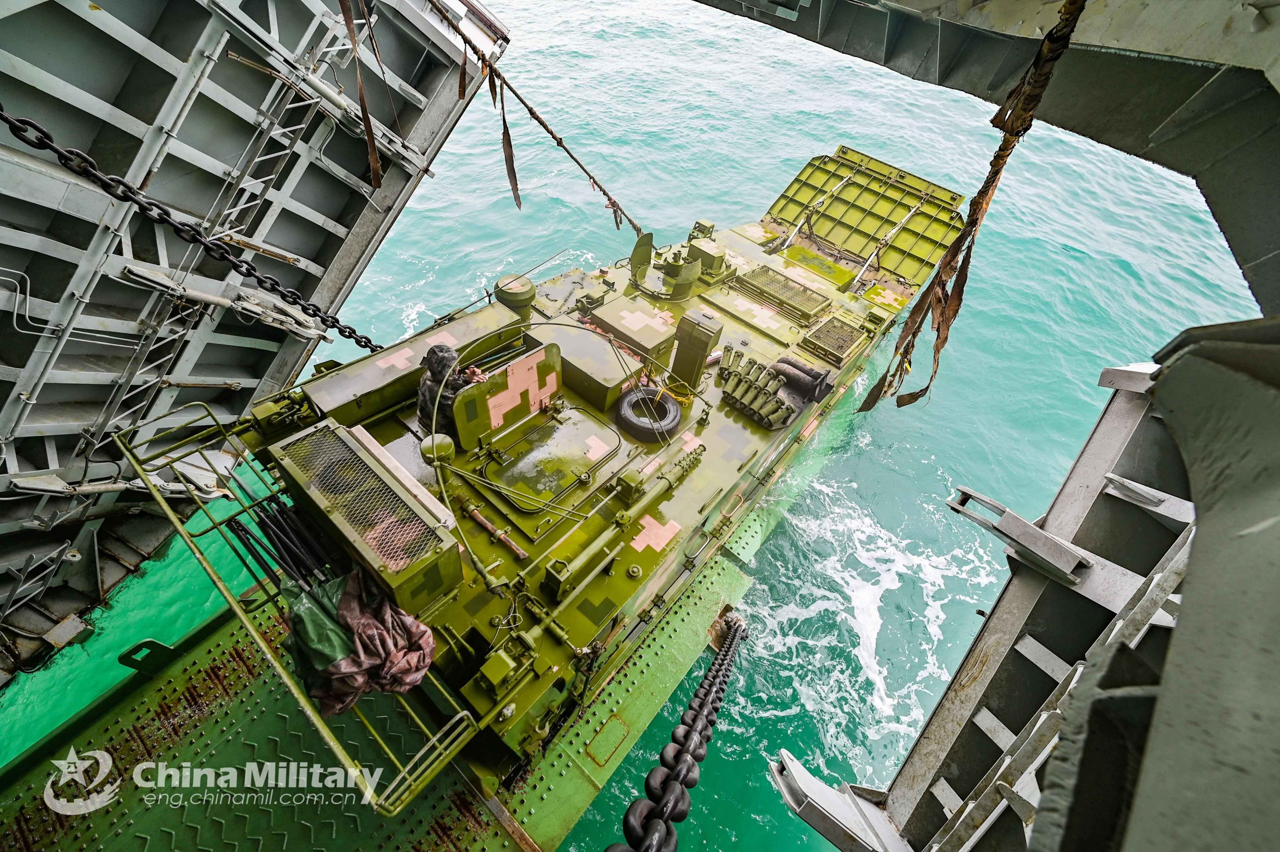 An amphibious armored infantry fighting vehicle (IFV) attached to a brigade under the PLA 73th Group Army steers off the well dock of a landing ship during the coordination training aiming to hone the troops' combat capabilities in maritime operations on May 26, 2021. (eng.chinamil.com.cn/Photo by Lin Jiayu)