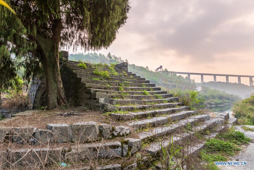 The Mengjia ancient bridge, built in 1882, is pictured along with the Yinpo River grand bridge of the Guiyang-Nanning high-speed railway (in the distance) in Dushan County, southwest China's Guizhou Province, April 1, 2021. (Xinhua/Liu Xu)