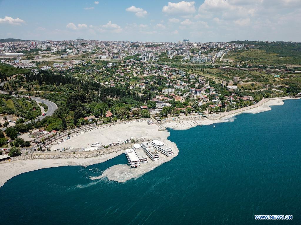 Aerial photo taken on June 6, 2021 shows Mucilage, also known as "sea snot" in the Marmara Sea in Istanbul, Turkey. According to local press reports, the sea snot, which has started from the country's biggest city Istanbul, spread to several other provinces along the coast of the Marmara Sea and the northern Aegean Sea. The substance, which seriously threatens the environment and underwater life, now covered a large part of the Marmara Sea, forcing the government to take urgent action that will be launched on Tuesday in Istanbul. (Photo by Osman Orsal/Xinhua)
