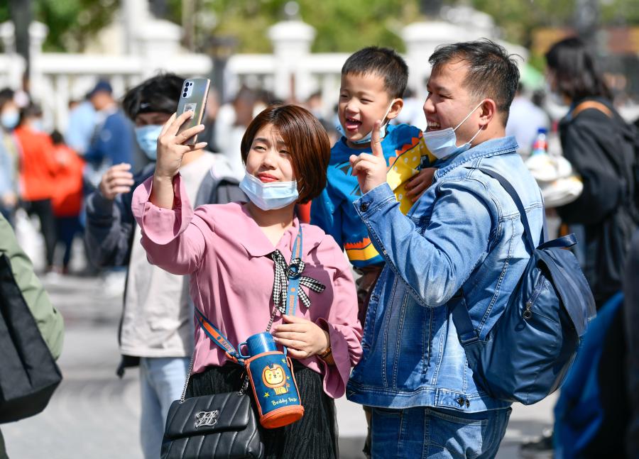 Tourists pose for selfie at the Italian Style Area in Hebei District of north China's Tianjin, May 1, 2021. (Xinhua/Sun Fanyue)