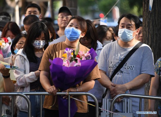 Parents wait outside an exam site at a middle school in Beijing, capital of China, June 10, 2021. The annual college entrance exam concluded Thursday in Beijing. (Xinhua/Ren Chao)