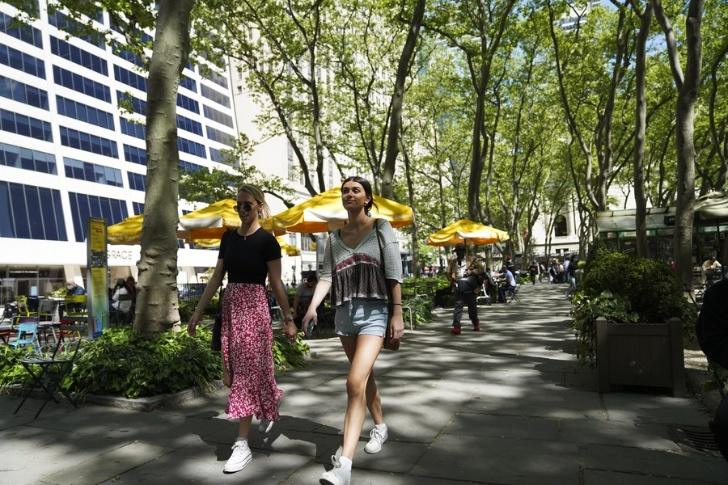 People walk through Bryant Park in New York, the United States, May 14, 2021. (Xinhua/Wang Ying)