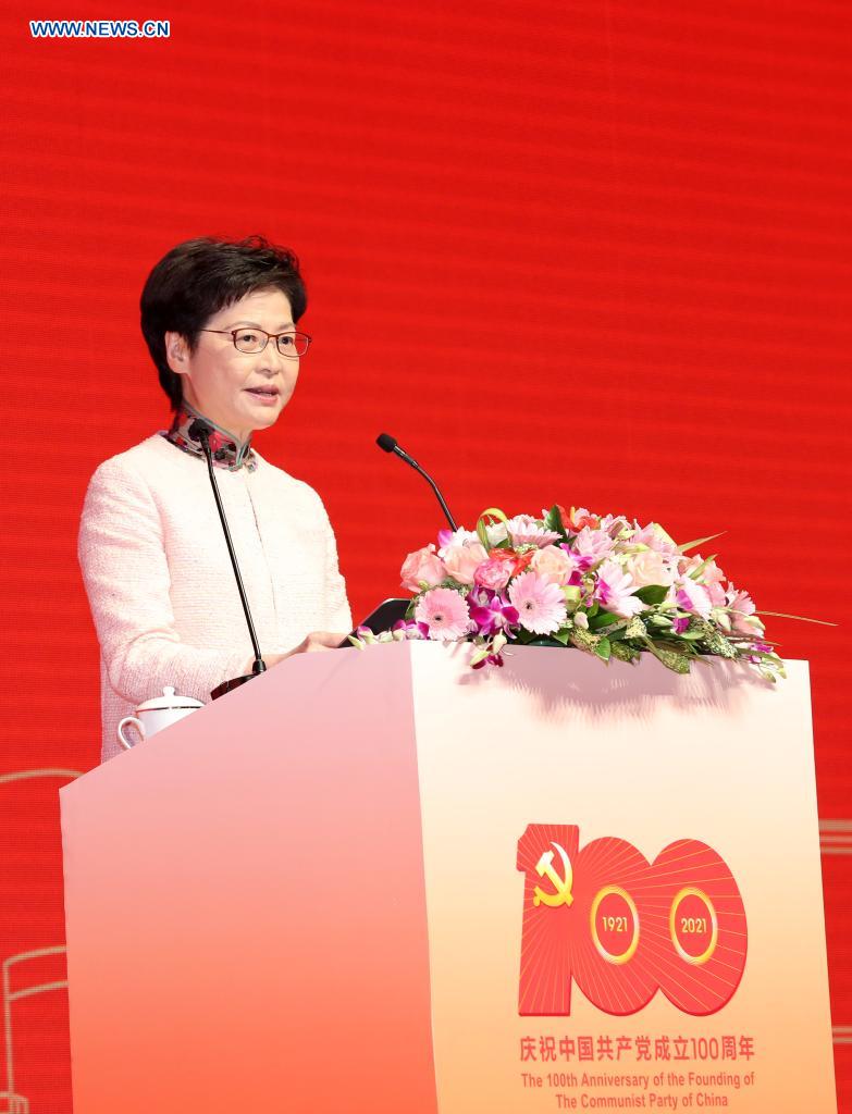 Carrie Lam, chief executive of the Hong Kong Special Administrative Region (HKSAR), speaks during a forum under the theme of "the Communist Party of China (CPC) and 'one country, two systems,'" to mark the 100th anniversary of the founding of the CPC, in Hong Kong, south China, June 12, 2021. (Xinhua/Li Gang)