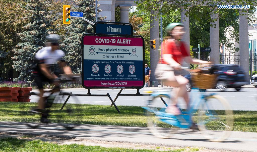 Cyclists pass a billboard reminding people to practice physical distancing in Toronto, Canada, on June 12, 2021. Canada reported 1,115 new daily cases of COVID-19 on Saturday, bringing the cumulative total to 1,400,827, including 25,910 deaths, according to CTV. (Photo by Zou Zheng/Xinhua)