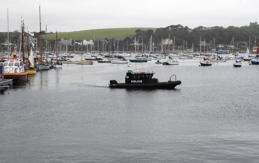A police boat patrols in Falmouth, Cornwall, Britain, on June 11, 2021. (Xinhua/Han Yan)