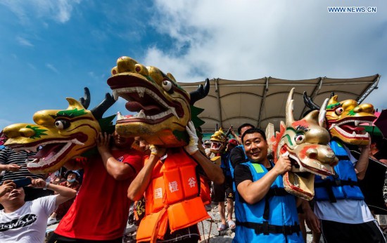Participants carry the dragon boat heads to the river before a dragon boat race to celebrate the Dragon Boat Festival in Zigui County, central China's Hubei Province, June 14, 2021. China celebrated the Dragon Boat Festival on Monday to commemorate Qu Yuan, a patriotic poet from the Warring States Period (475-221 BC) believed to have been born in Zigui County. (Photo by Zheng Jiayu/Xinhua)