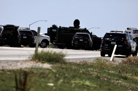 Police officers investigate at the scene where the gunman was killed in Fullerton shootout in Los Angeles, California, the United States, April 27, 2021. (Xinhua)