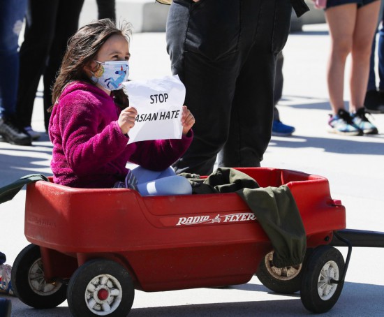 A girl protests hate crimes against Asian Americans in Atlanta, Georgia, the United States, March 20, 2021. (Photo by XiaoHeng Wang/Xinhua)