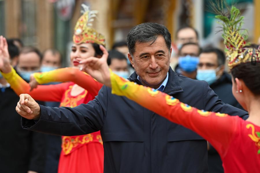 Vladimir Norov, secretary-general of the Shanghai Cooperation Organization (SCO), dances with an actress at the International Grand Bazaar in Urumqi, northwest China's Xinjiang Uygur Autonomous Region, March 30, 2021. (Xinhua/Ding Lei)