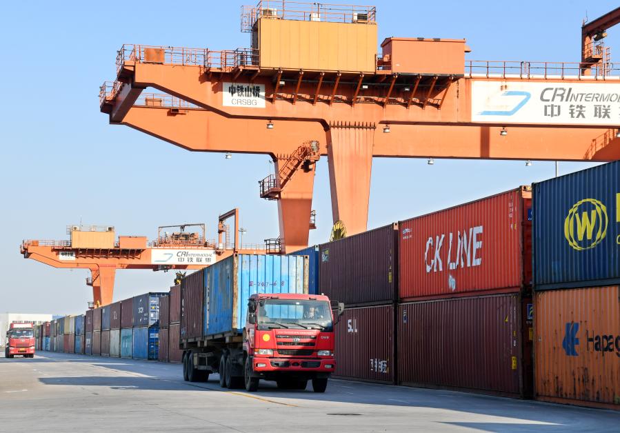 A truck hauling containers passes the freight yard of the multimodal transport center in the China-Shanghai Cooperation Organization (SCO) local economic and trade cooperation demonstration zone in Qingdao, east China's Shandong Province, Nov. 9, 2020. (Xinhua/Li Ziheng)