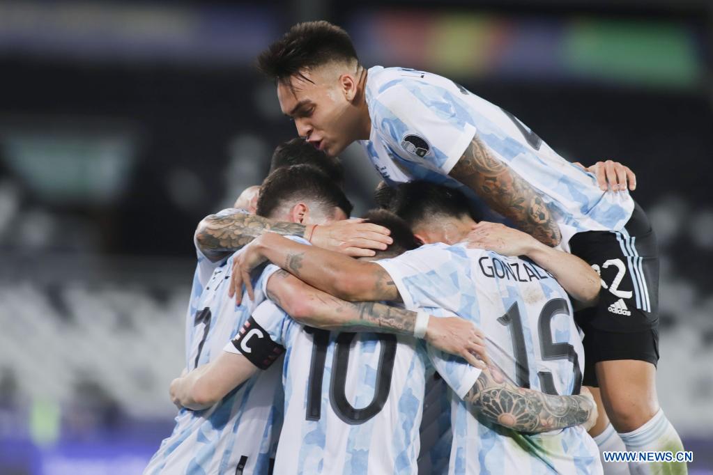 Players of Argentina celebrate during the Group A match between Argentina and Chile at the 2021 Copa America in Brasilia, Brazil, June 14, 2021. (Xinhua/Rahel Patrasso)
